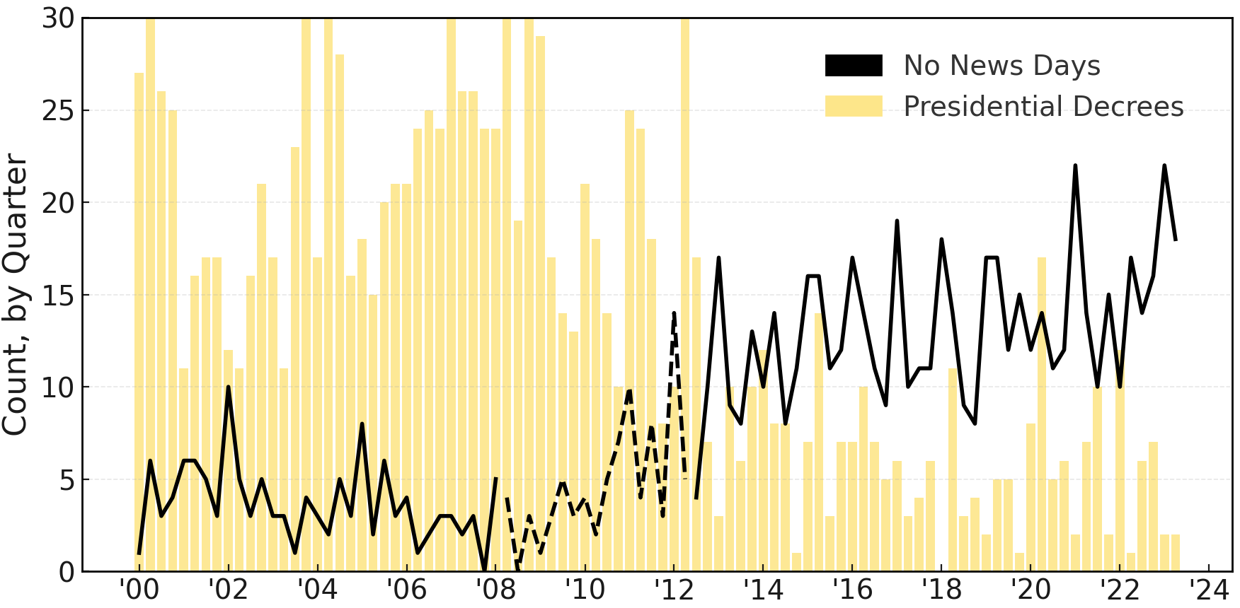 Drawing on twenty-five years of daily data from the Kremlin’s official website, I analyze the logic of Putin’s media presence and absence. I identify systematic patterns in the days when he is missing from the public record and study what happens around stretches of prolonged absence. I juxtapose routine news silence with presidential decree signing, tracing how “appearance” via decrees relates to days without public events and how these dynamics evolve over time. By tracing an autocrat’s public visibility over a quarter-century, I shed light on the broader question of how leaders manage information control and maintain legitimacy.